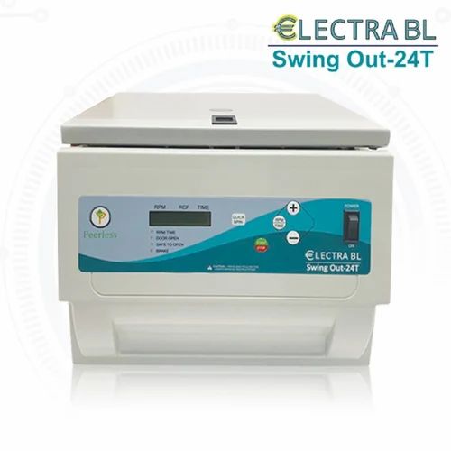 The Peerless Electra BL Swingout 24T Lab Centrifuge is a tabletop model designed for high-performance separation in laboratories, featuring microprocessor control, an LCD display, and a brushless motor.